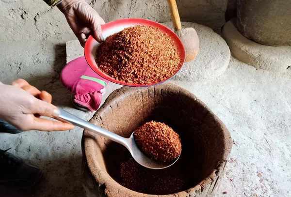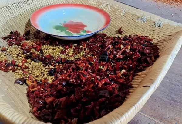 也有一些人家里没有木窝和压载锤,就用石磨清理。起初,辣椒的质地密切相关,但煮熟后变得相对棕色,然后变脆以释放辣椒的味道。