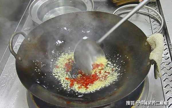 锅内烧油,油热后倒入蒜沫,剁椒,翻炒均匀,因为剁椒的咸味太重,我们把剁椒和青红椒炒在一起。中和一下咸味,倒入青红椒继续翻炒。
