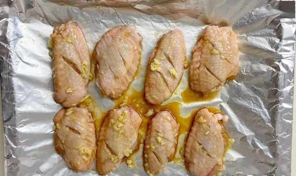 4、将腌制好的鸡翅放在烤盘上,两面均匀刷上步骤3中炒好的蒜油,蒜末和腌出来的料汁也一起浇上去;