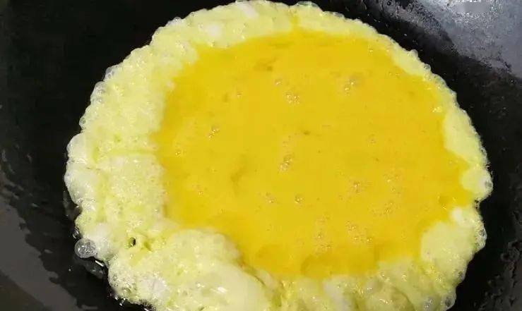 2、鸡蛋敲入碗中,顺着一个方向搅拌均匀,然后热锅加油,倒入蛋液,小火煎至凝固后,铲成小块盛出来;