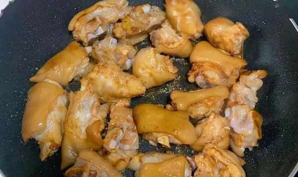 2、热锅加油,放入1小把冰糖,小火炒融化后,倒入猪蹄,不断翻炒至上色;