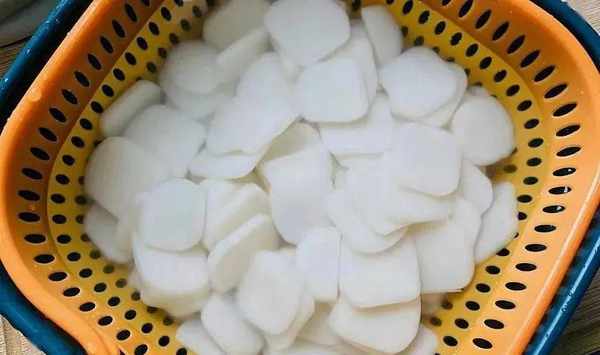 1、年糕洗净,冷水下锅,水开后再煮3分钟,煮到变软的程度,将年糕捞出来过下凉水,控干水分;
