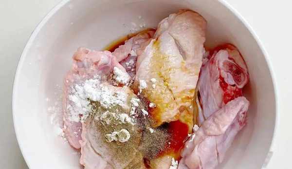 2、往鸡翅中放一些料酒、生抽、蚝油、蜂蜜、生粉、黑胡椒粉(少许),抓匀后腌制2个小时,也可以放入冰箱中冷藏一晚;