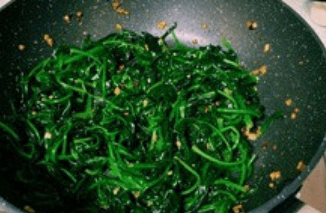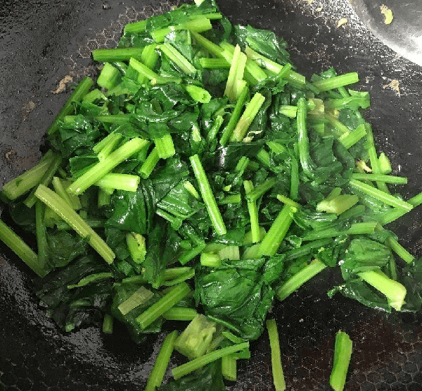 3:起锅烧油,烧热油开之后下入菠菜翻炒,加入适量的食用盐,炒出水之后加入适量的味素提鲜即可,装盘出锅。