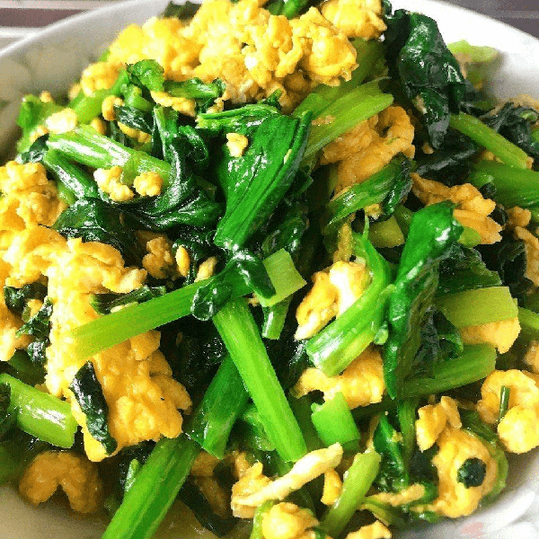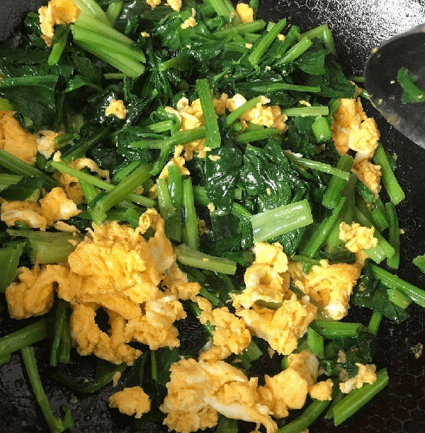 5:锅内烧热油,下入鸡蛋快速翻炒,成熟之后,下入菠菜段一起翻炒,期间加入少量的食盐再次调味,注意不要放多了适量即可。