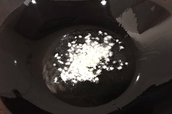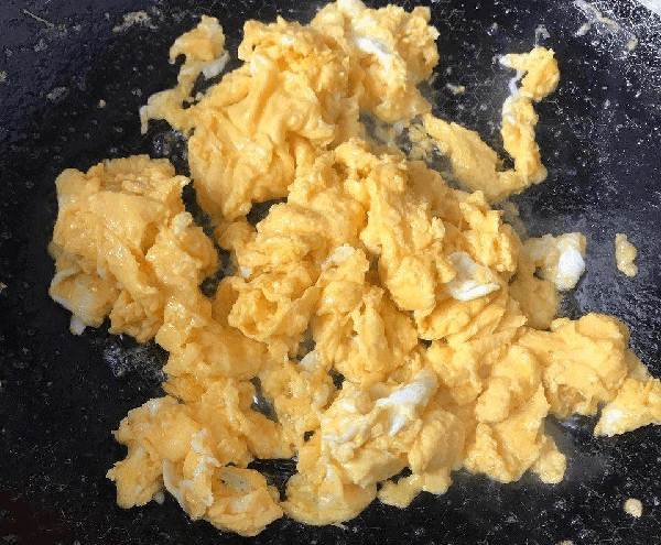 3:碗中打入4个鸡蛋,然后加入少量的食用盐,拌匀调味,下锅翻炒炒熟。