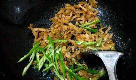 6.热锅剩炒肉丝的余油、放青椒、榨菜、炒至青椒断生