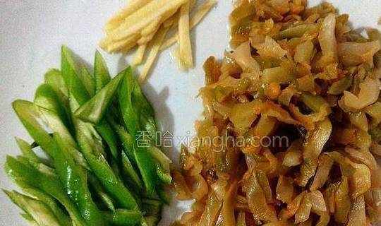 3.清洗干净、榨菜、青椒去籽切丝、姜切丝