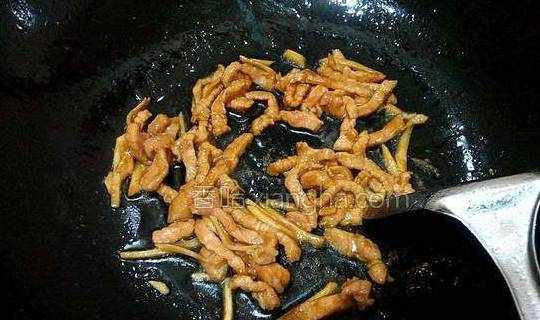 4.热锅放油、放姜爆香、放肉丝翻炒、炒至肉丝变色