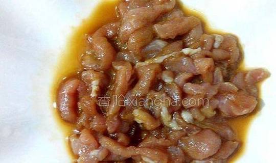 2.瘦肉切片、再切丝、用生粉、酱油、盐、腌制10分钟