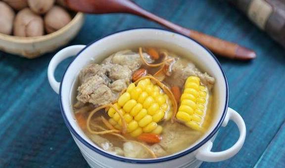排骨洗净砍段,玉米切小块,枸杞和虫草花浸泡10分钟排骨冷水下锅煮沸3分钟,去除血水,捞出温水洗净浮沫排骨放入砂锅内,放入玉米,枸杞和虫草花加入料酒,胡椒粉,加入适量的清水,姜片大火煮沸后转小火焖煮40分钟最后调入盐调味即可