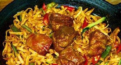 焖面在北方比较流行,做法大同小异,配料略有不同,先把羊肉和菜下锅炒,然后把菜汤倒到一个稍大一点的碗里。菜不用出锅,把面放在菜上面,然后在菜汤中加入一定比例的凉水,按1:1的比例加的,把稀释后菜汤慢慢的再浇回锅里,最好是每一根面条都要浇到。盖上锅盖,时间不能长,十分左右就差不多,打开锅盖,看到面条基本上呈半透明状,再淋上一些香油,一道荤素兼备,有菜有饭的焖面就成了。