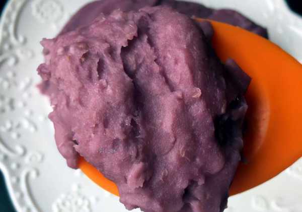 制作过程:第一步,紫薯和芋头分别准备出适量,将其清洗干净,削去皮,隔水放入锅中蒸15分钟,用勺子将紫薯和芋头压成泥,两者混合在一起,趁热加入炼乳;