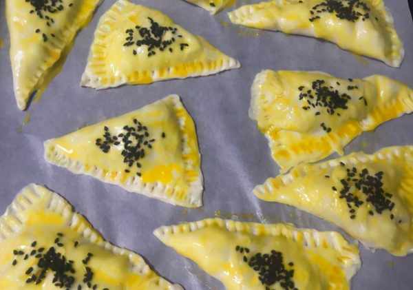 第四步,将面皮对折一下,边缘处用叉子压紧,按照这个方法,将剩余的手抓饼都做好,表面刷上一层蛋液,再撒上点芝麻做点缀,依次摆放在铺上油纸的烤盘上;