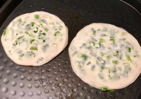第四步,按照这个方法做好所有的,平底锅刷上少许的食用油,将葱油饼胚子放入锅中,可以一次多放几张,铺开便可,小火慢慢煎;