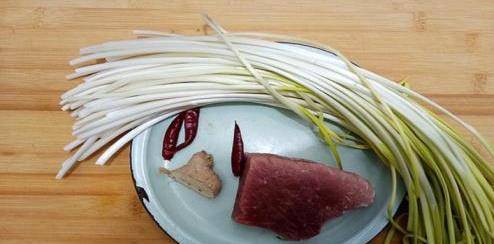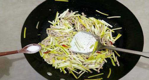 第4步,这时候我们就可以放入,提前切好的蒜白,翻炒一会儿之后,再次放入蒜黄,然后大火翻炒3~5分钟左右,就可以把火关掉了。这一步主要就是让肉和辣椒的味道充分的融合在一起,之后我们再撒入适量的食盐,开火翻炒一分钟左右,这时就熟了就可以出锅了。