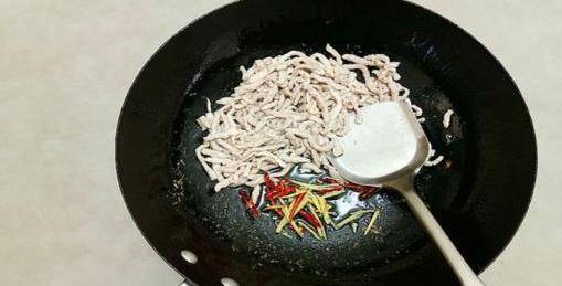 第3步,这时我们把锅中,倒入适量的油,油温,6成热时,把我们腌制好的肉丝放入锅中翻炒,肉的颜色变成白色以后,这时我们放入切好的干辣椒和姜,把它们炒出香味儿。一定要在肉丝变白时就把干辣椒和姜放进去翻炒,这样才会保留住它们的香味。