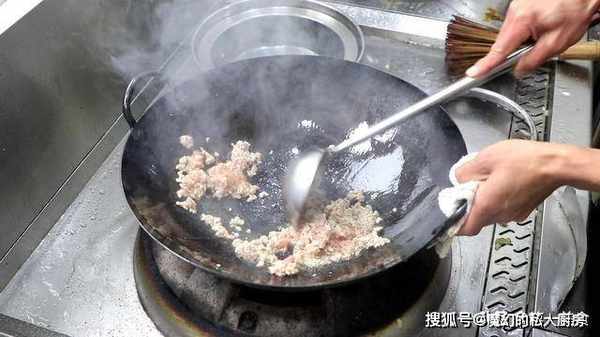 4.锅内烧油,把油烧热,充分滑锅以后,倒出热油,再加入凉油,倒入肉末用勺子快速翻炒,把肉粒炒至发白,因为是热锅凉油,肉末并不会粘锅。