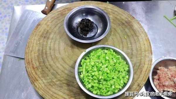 3.清洗干净的芹菜切成芹菜粒,准备一个小盆,放入橄榄菜两大勺,食材全部准备好以后,我们进行下一步操作。