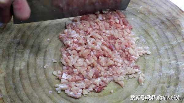 1.首先我们准备一下食材,瘦肉一块先切成厚片,再改刀切成肉丝,然后把肉丝切碎,剁成肉粒放在盆中,肉粒不要剁的太碎。