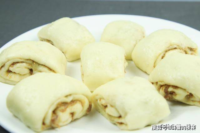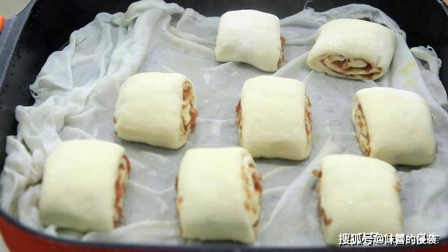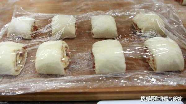 用刀切成4厘米左右的花卷,像图中那样摆放好,两个花卷之间要隔上一点空隙,用保鲜膜盖上再次饧发8到10分钟左右。