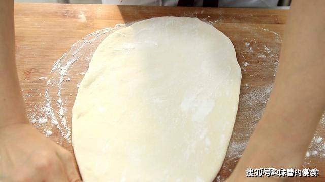 4.在案板上撒上一点面粉,把面团取出放在案板上,揉搓排一下面团里面的气,把面团揉光滑,揉成一个圆面坯,撒上一点面粉用擀面杖擀开,擀成一个椭圆形的面皮,面皮要擀的稍微厚一点。