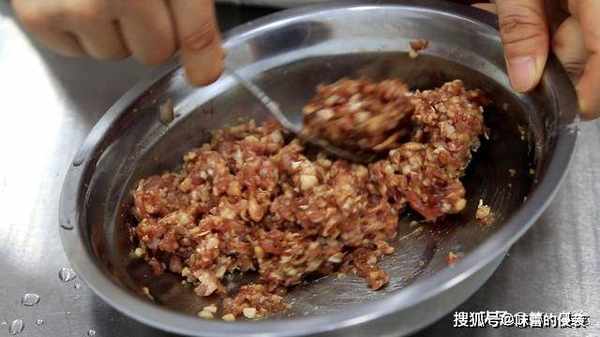2.在等待面粉发酵的这个时间,我们把五花肉馅调一下,放入食盐2克、蚝油2克、老抽2克、芝麻香油3克、十三香2克、 打入一个鸡蛋清用勺子把肉馅搅拌均匀。