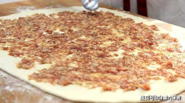 5.然后把调好的肉馅均匀的涂抹在面皮上面,尽量的让肉馅薄厚一致,然后从一边开始往里卷,最好是卷实一点。