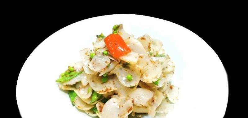 鲜百合300克、荷兰豆30克、甜豆仁40克、彩椒2片、盐、白糖、麻虾酱