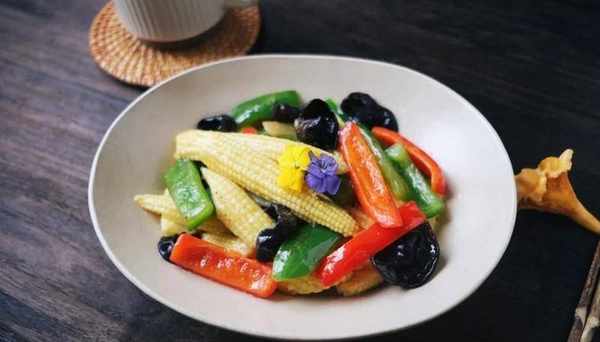 净锅后烧热油,下入葱姜爆香,倒入青红椒条翻炒一下,倒入焯水后的玉米笋和木耳翻炒至成熟,下入盐、糖、鸡精调味后勾芡淋尾油出锅即可。