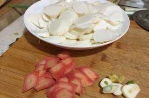 山药去皮洗净切片,自己家吃,本着不浪费的选择,圆片就行了。胡萝卜,蒜洗净切片,葱切葱花