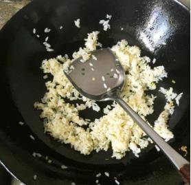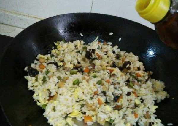 首先往锅中倒入适量的食用油,开火将其烧热,用手转动锅体,让食用油沾满铁锅内壁,再将热油到处往里面加入适量的食用油。然后立即下入准备好的隔夜米饭,用锅铲将米饭均匀的沾上一层食用油,再将其炒散,如果米饭当中有硬块的话,最好是用锅铲压一下,再把全部炒散后的米饭盛出。