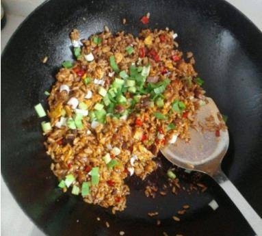 然后往锅中倒入适量的食用油开或将其烧热,再把另一半的鸡蛋液倒入锅中炒成块状,接着下入装有米饭的鸡蛋液,大火进行翻炒。随后往里面加入适量的生抽,食盐进行调味上色。最后撒上少许的葱花提香即可出锅。