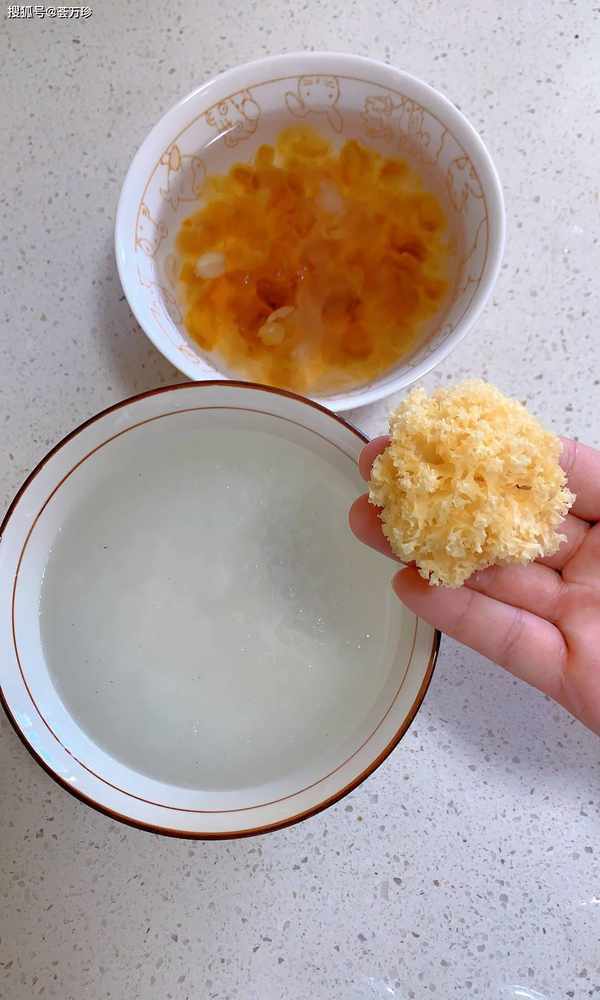 ②: 银耳用温水浸泡10分钟,去掉硬心,剪成小块。