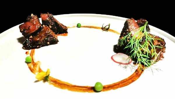 把低温处理好的牛肉猛火煎熟,放入黑松露酱抹匀即可装盘装饰