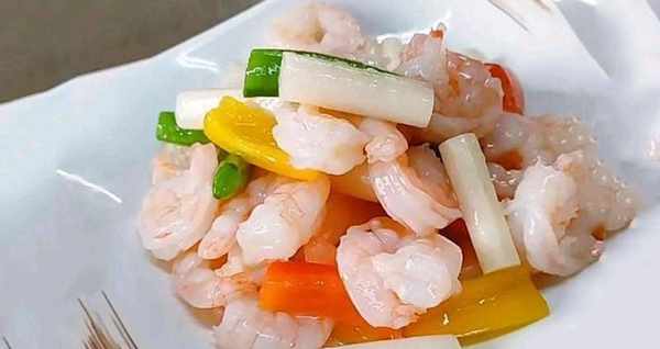 把鲜虾仁滑熟,加入辅料炒至入味,出锅装盘即可出餐