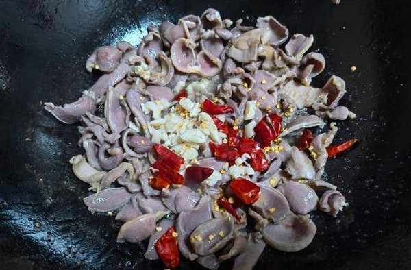 7、将鸡胗片炒至没有血色之后,放入事先准备好的干辣椒和蒜末进入锅中煸炒,炒出香味。