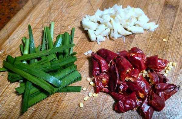 5、然后准备其他要用到的食材,将大葱洗净切成段,干辣椒切开,蒜去皮之后拍成蒜末备用,如图所示模样即可。
