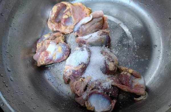 3、将新鲜的鸡胗的筋膜处理好之后,放入些许的食盐进行揉搓清洗,可以去除鸡胗表面的杂质,将鸡胗清洗得更加干净。