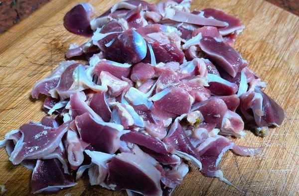 4、将洗好的鸡胗再次冲洗好后,控干水分放在砧板上,用刀切成薄薄的鸡胗片备用。