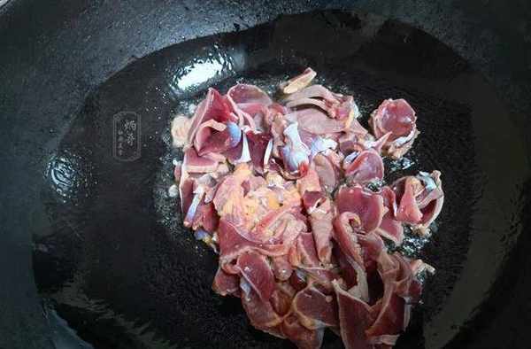6、准备好以上食材之后,取出常用的炒锅擦拭干净之后,倒入适量的食用油加热,加热至6成左右,将切好的鸡胗片倒入锅中煸炒。