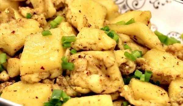5:在锅底留下一点点油,放上一勺孜然粉、一勺烧烤料搅拌均匀,最后放上炸好的鸡蛋块搅拌均匀就可以出锅了。