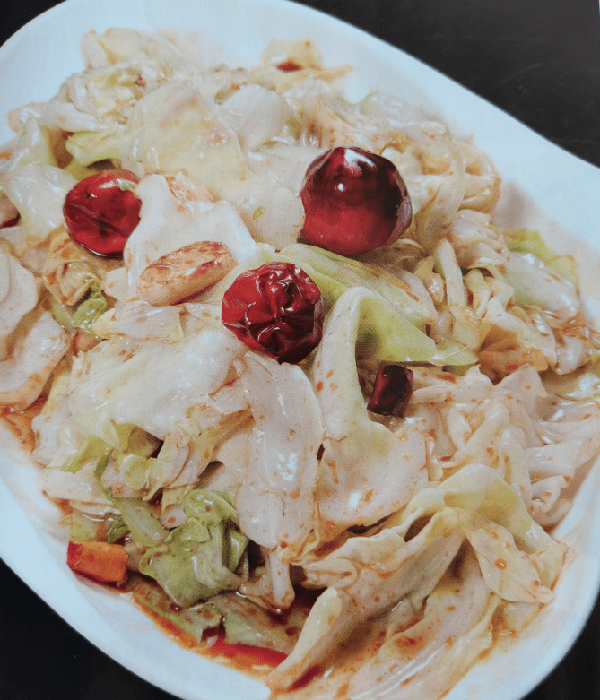 这款“爆炒卷心菜”看似平淡无奇,但点击率已完胜店内大多数荤菜,其超级旺销的秘密在于三点:第一,卷心菜要手撕;第二,自调一款酸辣咸香的“包菜汁”;第三,炒制时提前爆香两种辣椒,全程旺火,从下入卷心菜,到烹汁爆炒出锅,要将时间控制在13秒,使叶片在充分沾匀汤汁的同时还能保留爽脆清甜的口感。