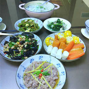 虾糕蒸肉饼,凉拌菜、炒苦瓜、冬瓜汤、蒸的玉米、胡萝卜、山药,看的出同时他们家很会养生。