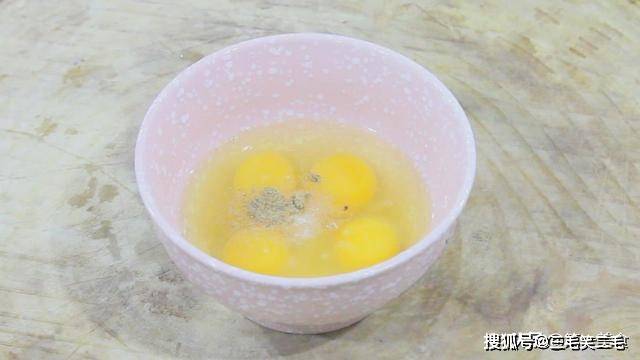 鸡蛋四个打在碗里,倒入各一平勺食盐,胡椒粉,用筷子搅拌开,拌匀。