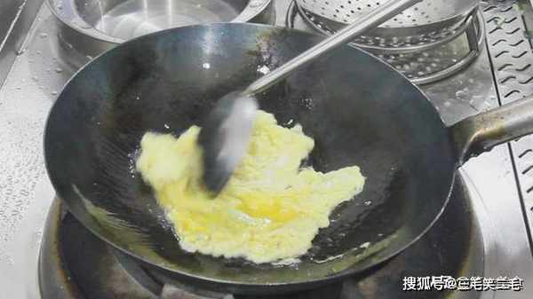 锅内烧油,油烧至微冒青烟,倒入鸡蛋。把鸡蛋炒至成型,铲出备用。