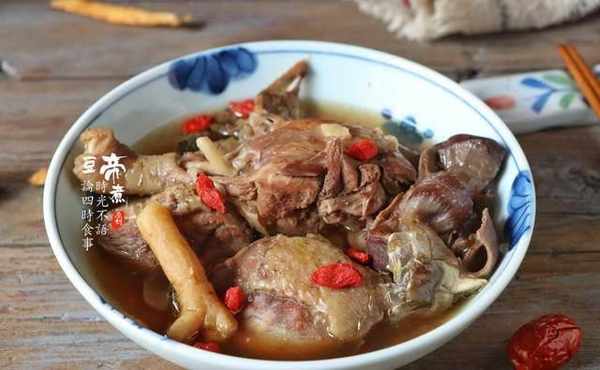 4、将鸭肉放入炖锅中,加入中药材和生姜,加水适量,大火煮沸后转小火炖两小时。