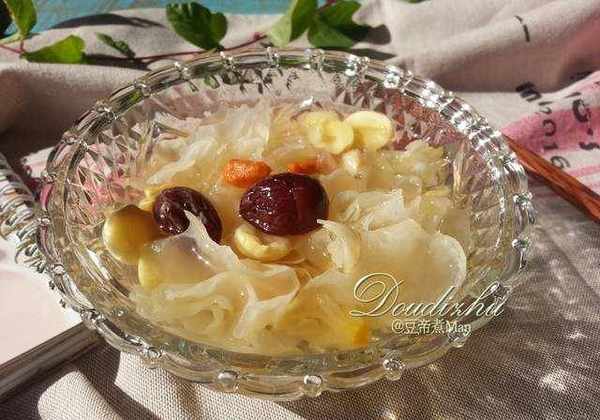 材料:莲子1粒、银耳1个、小百合1个、红枣4个、冰糖1个