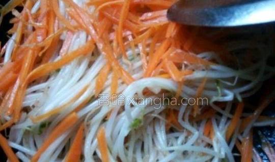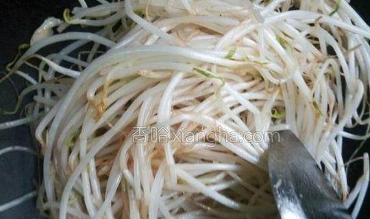 2.倒入豆芽,炒至变软。