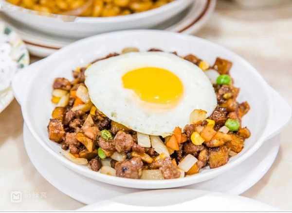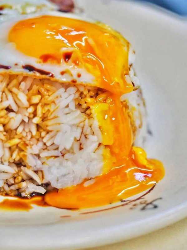 滑蛋叉烧饭上 两大颗溏心蛋,看上去就让人食欲大开。吃之前将蛋黄戳破,让蛋液裹满每一粒米饭,简直“销魂”。